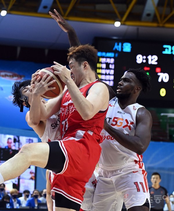 27일 전라북도 군산 월명체육관에서 열린 ‘2020 MG새마을금고 KBL CUP’ 서울 SK와 고양 오리온의 결승 경기에서 오리온 이승현이 SK 배병준, 워니와 리바운드를 다투고 있다.