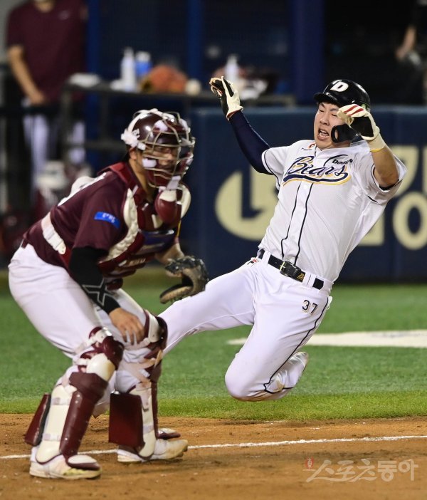 5회말 1사 1, 2루 두산 우전 2루타 때 1루주자 박건우가 홈으로 파고들어 세이프 되고 있다.