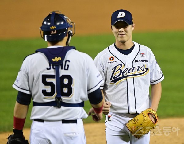 두산이 키움에 6-1로 승리를 거둔 뒤 박치국과 정상호가 기쁨을 나누고 있다.