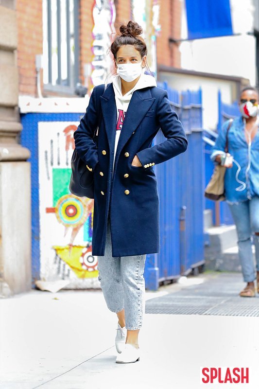 24일(현지시간) 미국 뉴욕에 한 거리에서 포착된 케이티 홈즈는 화이트 후드티와 데님 팬츠를 입고 그 위에 네이비색 코트를 매치한 캐주얼한 패션으로 자연스러운 멋을 선보였다.