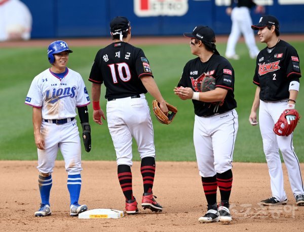 30일 대구 삼성라이온즈파크에서 ‘2020 신한은행 SOL KBO리그’ 삼성 라이온즈와 kt 위즈의 경기가 열렸다. 6회말 2사 1, 2루에서 삼성 2루 대주자 김성윤이 투수 교체 때 kt 선수들과 이야기를 나누고 있다.