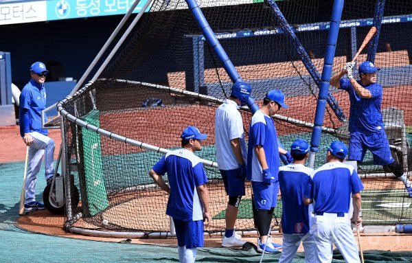 2일 창원 NC파크에서 ‘2020 신한은행 SOL KBO리그’ NC 다이노스와 삼성 라이온즈의 경기가 열린다. 경기에 앞서 삼성 허삼영 감독이 선수들의 훈련을 지켜보고 있다.