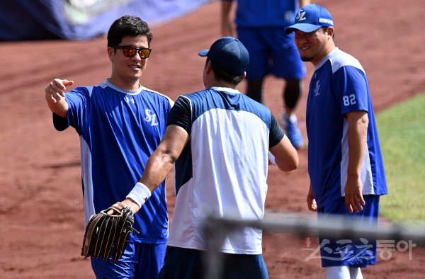 2일 창원 NC파크에서 ‘2020 신한은행 SOL KBO리그’ NC 다이노스와 삼성 라이온즈의 경기가 열린다. 경기에 앞서 삼성 강민호가 NC 김태군과 인사를 나누고 있다.