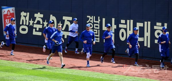2일 창원 NC파크에서 ‘2020 신한은행 SOL KBO리그’ NC 다이노스와 삼성 라이온즈의 경기가 열린다. 경기에 앞서 삼성 선수들이 외야에서 러닝 훈련을 하고 있다.