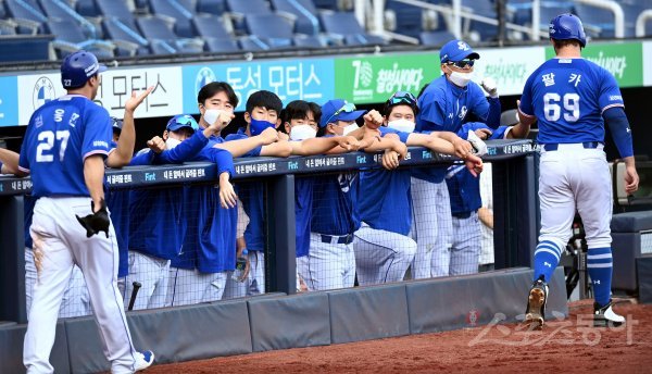 2일 창원 NC파크에서 ‘2020 신한은행 SOL KBO리그’ NC 다이노스와 삼성 라이온즈의 경기가 열렸다. 8회초 2사 만루에서 삼성 박해민의 2타점 적시타 때 득점에 성공한 김응민, 팔카가 동료들의 환영을 받고 있다.