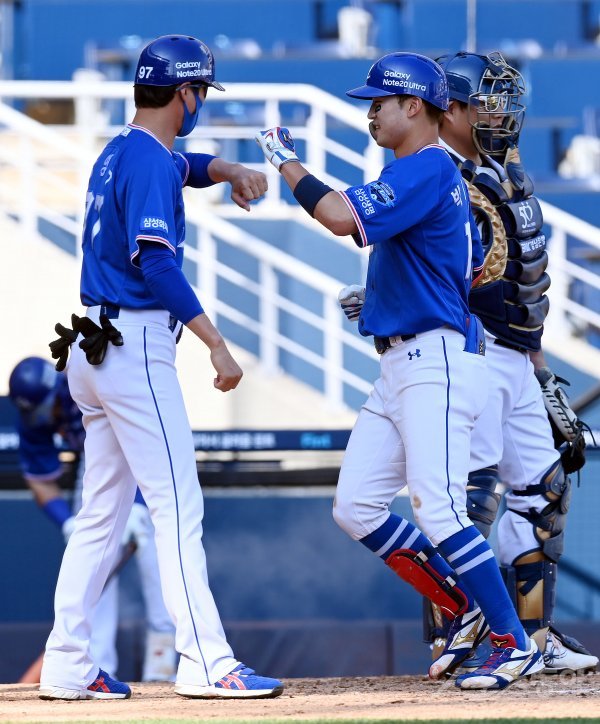 3일 창원 NC파크에서 ‘2020 신한은행 SOL KBO리그’ NC 다이노스와 삼성 라이온즈의 DH 1차전 경기가 열렸다. 4회초 1사 1루에서 삼성 박해민이 투런 홈런을 쏘아 올린 뒤 강명구 코치의 환영을 받고 있다.