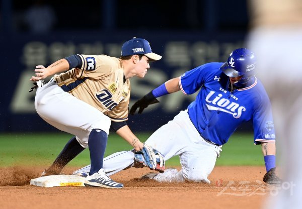 3일 창원 NC파크에서 ‘2020 신한은행 SOL KBO리그’ NC 다이노스와 삼성 라이온즈의 DH 2차전 경기가 열렸다. 4회초 무사 1루에서 삼성 이원석의 삼진 아웃 때 1루 주자 김동엽이 2루 도루를 시도했으나 NC 박민우에게 태그 아웃되고 있다.