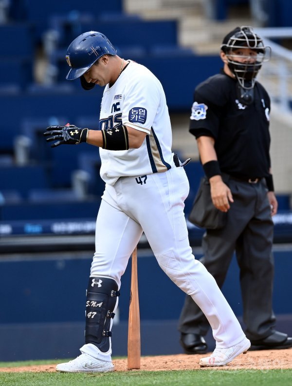 3일 창원 NC파크에서 ‘2020 신한은행 SOL KBO리그’ NC 다이노스와 삼성 라이온즈의 DH 1차전 경기가 열렸다. 7회말 1사 만루에서 NC 나성범이 삼진 아웃으로 물러나고 있다.