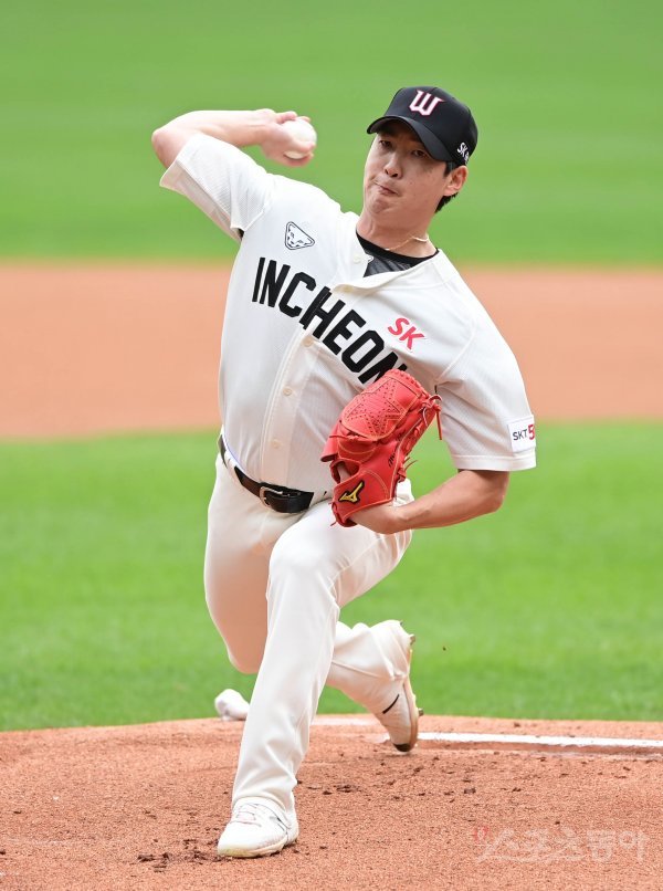 4일 인천 SK행복드림구장에서 ‘2020 신한은행 SOL KBO리그’ SK 와이번스와 키움 히어로즈의 경기가 열렸다. 1회초 SK 문승원이 마운드에 올라 역투하고 있다.