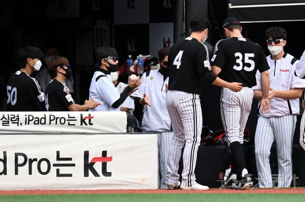 4일 수원 KT위즈파크에서 ‘2020 신한은행 SOL KBO 리그’ LG 트윈스와 KT 위즈 경기가 열렸다. LG 선발 윌슨이 3회말 2사 1,2루 상황에서 자진 강판되고 있다.
