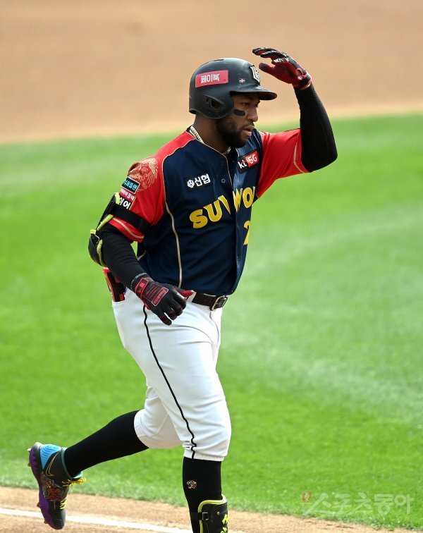 4일 수원 KT위즈파크에서 ‘2020 신한은행 SOL KBO 리그’ LG 트윈스와 KT 위즈 경기가 열렸다. 1회말 2사 KT 로하스가 우월 솔로 홈런을 날린 후 그라운드를 돌고 있다.