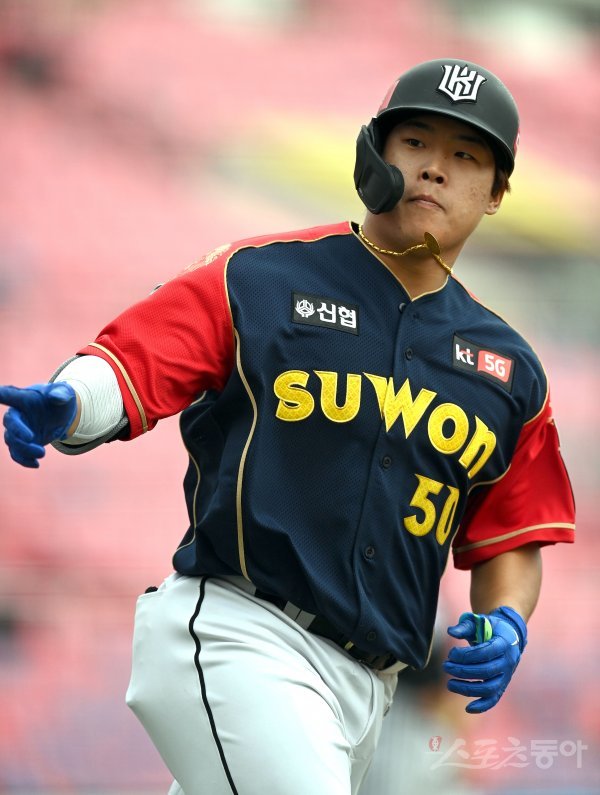 6회말 2사 KT 강백호가 역전 우월 솔로 홈런을 날린 후 그라운드를 돌고 있다.
