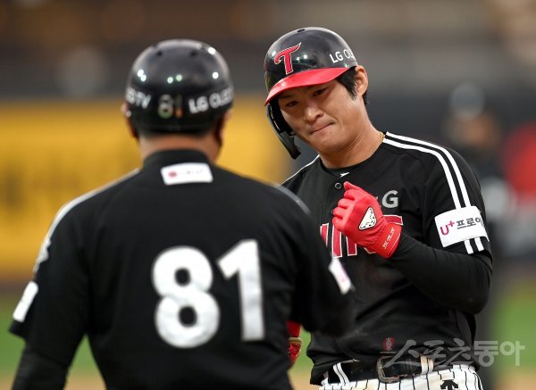 8회초 2사 만루 LG 오지환이 2타점 적시타를 치고 1루에서 기뻐하고 있다.