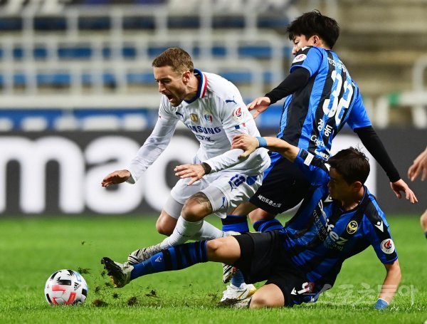 수원 타가트가 인천 문지환에게 태클을 당하고 있다.