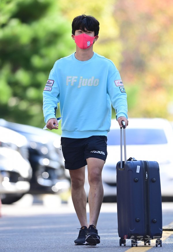 축구국가대표팀 이현식이 ‘2020 하나은행컵 축구국가대표팀 vs 올림픽대표팀’ 친선경기를 앞두고 5일 파주 축구대표팀트레이닝센터(NFC)로 입소하고 있다.