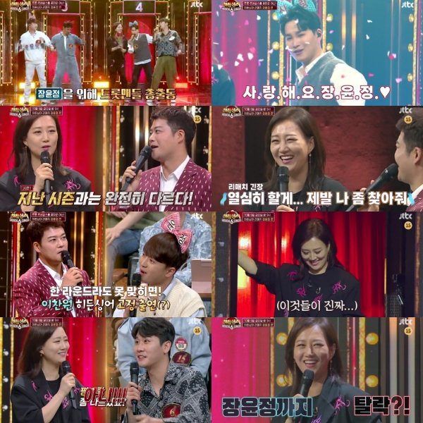 그러나 라운드가 시작되고 나서 트롯맨들뿐 아니라 진짜 장윤정을 “가짜”라고 했던 딘딘까지 처참하게 무너졌고, 통 안에서 나온 장윤정은 “감 떨어졌냐?”라며 후배들을 원망했다. 영탁은 조심스럽게 “평소랑 좀 다르셨죠?”라고 물었지만 장윤정은 어이없다는 듯이 “아니!”라고 답했다.