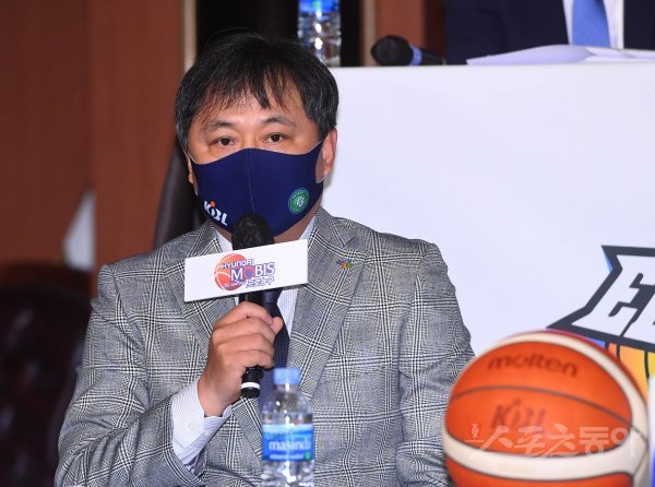 6일 서울 송파구 방이동 올림픽파크텔에서 열린 ‘2020-2021 현대모비스 프로농구 개막 미디어데이’에서 원주 DB 이상범 감독이 인사말을 하고 있다.