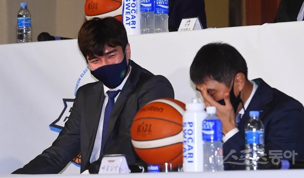 6일 서울 송파구 방이동 올림픽파크텔에서 열린 ‘2020-2021 현대모비스 프로농구 개막 미디어데이’에서 원주 DB 김종규가 서울 삼성 이상민 감독을 바라보며 웃고 있다.