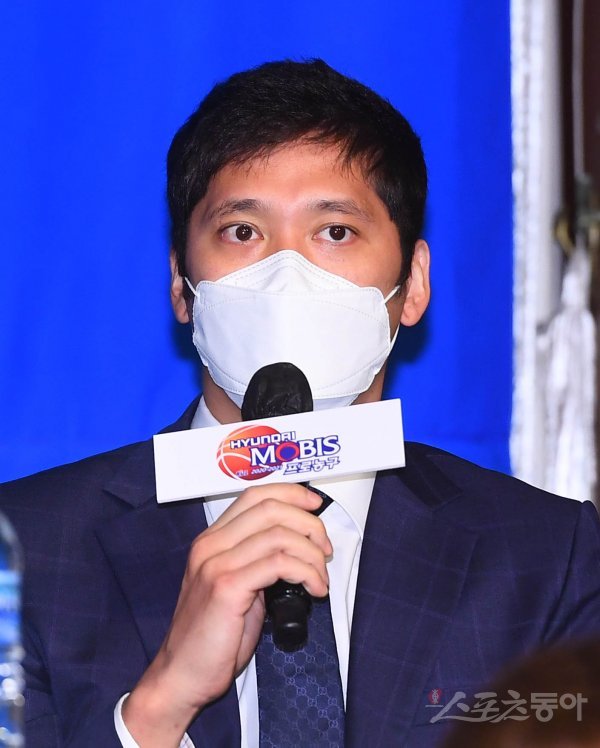 6일 서울 송파구 방이동 올림픽파크텔에서 열린 ‘2020-2021 현대모비스 프로농구 개막 미디어데이’에서 울산 현대모비스 함지훈이 인사말을 하고 있다.