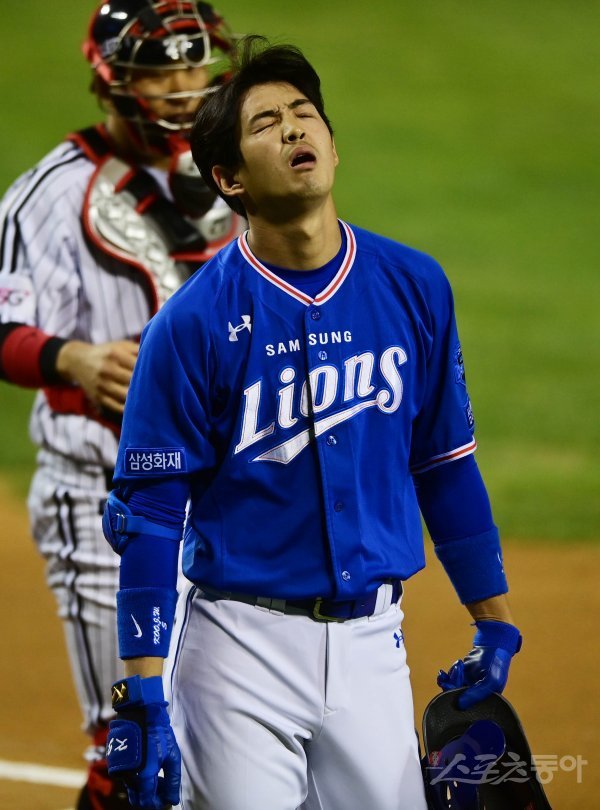 1회초 무사 1, 2루 삼성 구자욱이 몸에 맞는 공에 고통을 호소하고 있다.