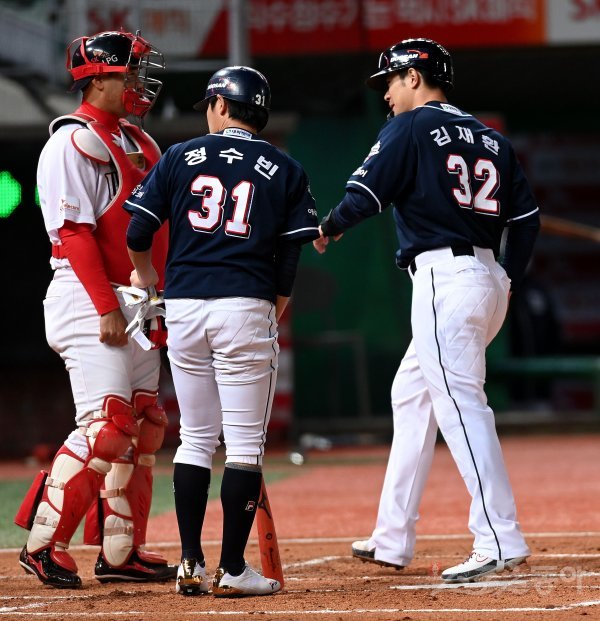2회초 1사 만루에서 두산 정수빈이 밀어네기 볼넷을 얻은 뒤 3루 주자 김재환이 득점에 성공하고 있다.