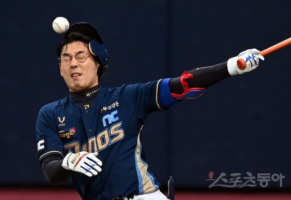 1회초 무사 NC 김성욱이 파울 타구에 맞고 있다.