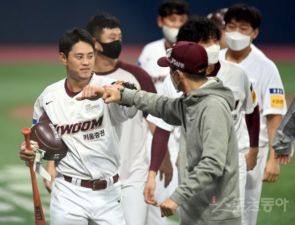 9회말 1사 1,2루 키움 허정협이 끝내기 안타를 친 후 손혁 감독의 축하를 받고 있다.
