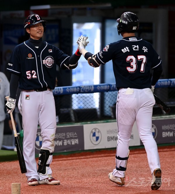 8회초 무사에서 두산 박건우가 솔로 홈런을 쏘아 올린 뒤 김재호의 환영을 받고 있다.
