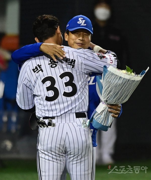 9회말이 종료된 뒤 LG 박용택이 KBO리그 통산 첫 번째 2,500안타 달성 기념 시상식에서 삼성 김용달 코치에게 꽃다발을 받고 있다.