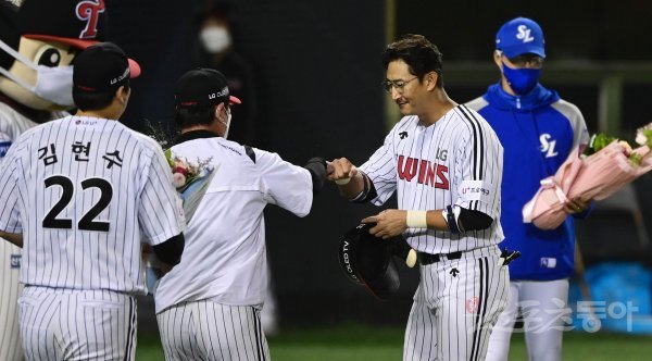 9회말이 종료된 뒤 LG 박용택이 KBO리그 통산 첫 번째 2,500안타 달성 기념 시상식에서 류중일 감독의 축하를 받고 있다.