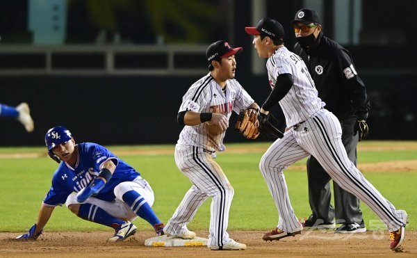 6회초 무사 1루 삼성 김호재의 내야 땅볼 때 LG 2루수 정주현이 토스된 볼을 놓친 뒤 아쉬워하고 있다.