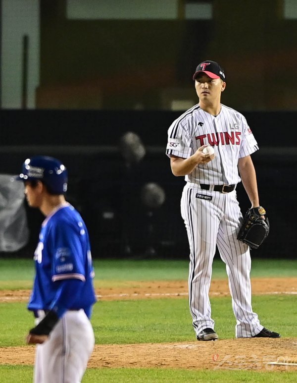 9회초 1사 1, 2루 삼성 강한울의 타석 때 LG 고우석이 수비진들을 바라보고 있다.
