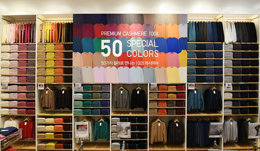 유니클로 캐시미어 컬렉션은 천연 캐시미어 100%로 제작해 부드러운 착용감과 고급스러운 광택이 특징이다. 10만 원 이하의 합리적 가격으로 캐시미어의 대중화를 이끈 아이템이다. 이번 가을·겨울 시즌에는 캐시미어 색상을 50가지로 대폭 확대했다. 회색, 갈색, 네이비 등의 기본적인 색상부터 개성 강한 빨강, 보라에 이르기까지 다양한 색상 스펙트럼을 통해 취향에 따라 선택할 수 있다.