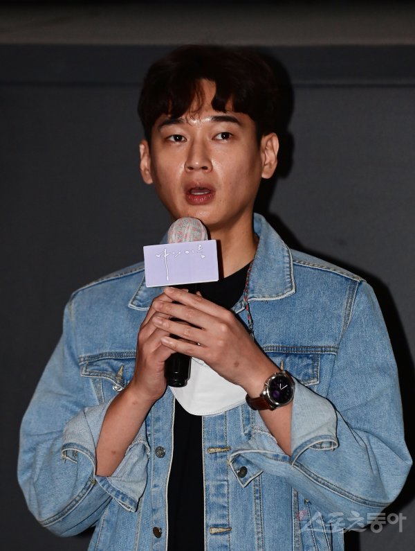 배우 김민기가 7일 서울 광진구 자양동 롯데시네마 건대입구점에서 열린 영화 ‘나의 이름’ 언론시사회 상영 전 무대인사에서 인사말을 하고 있다.