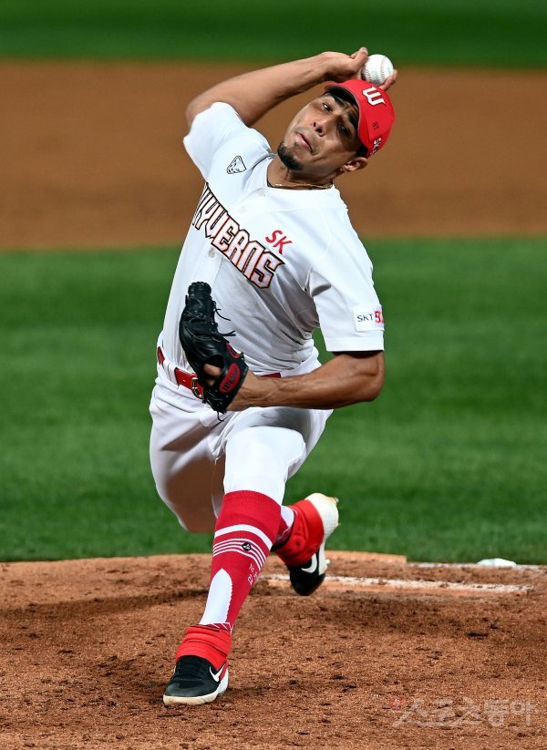 SK 선발투수 핀토가 힘차게 볼을 던지고 있다.