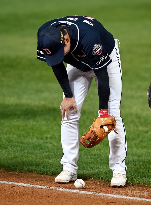 6회말 1사에서 SK 최지훈의 번트 타구를 두산 허경민이 파울 라인으로 넘어가기를 기다리고 있다.