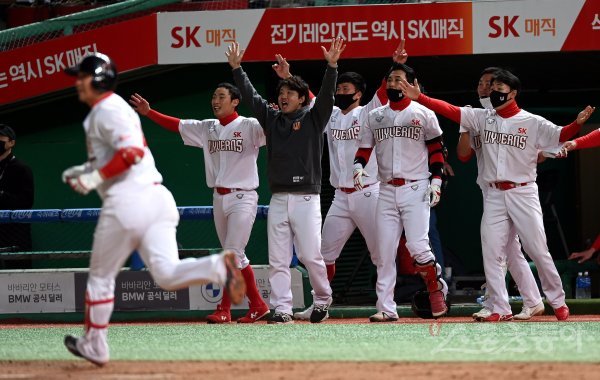 9회말 2사에서 SK 최정이 끝내기 솔로 홈런을 쏘아 올리자 더그아웃의 동료들이 환호하고 있다.