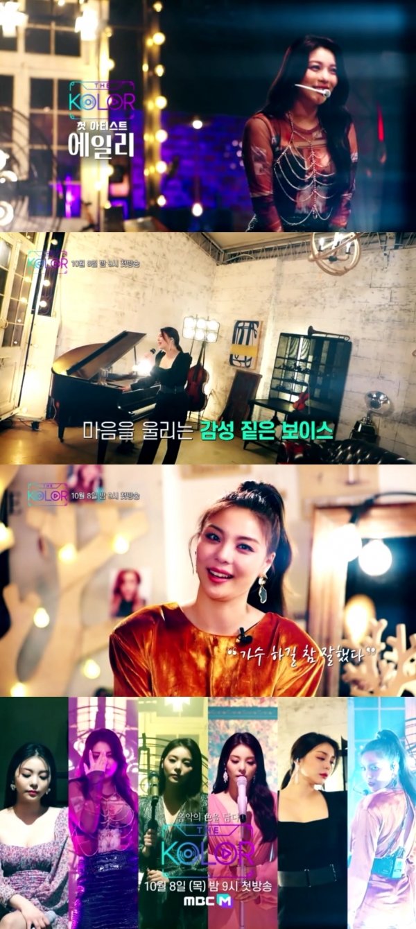 에일리는 8일 오후 9시 방송되는 MBC M '더 컬러(The Kolor)'의 첫 번째 아티스트로 출격한다. '더 컬러'는 K-POP 아티스트들의 음악적 색과 퍼포먼스를 다양하게 보여주는 정통 라이브 콘서트 프로그램이다.