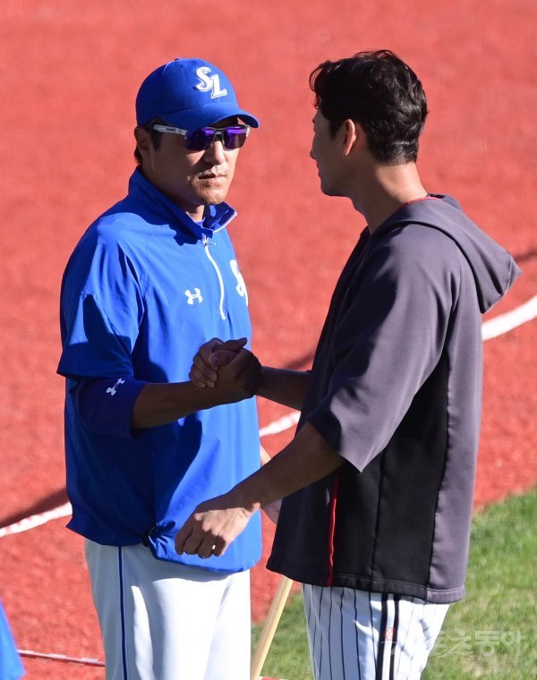 8일 서울 잠실야구장에서 ‘2020 신한은행 SOL KBO리그’ LG 트윈스와 삼성 라이온즈의 경기가 열린다. 경기 전 훈련에서 삼성 최태원 코치가 박용택과 인사하고 있다.