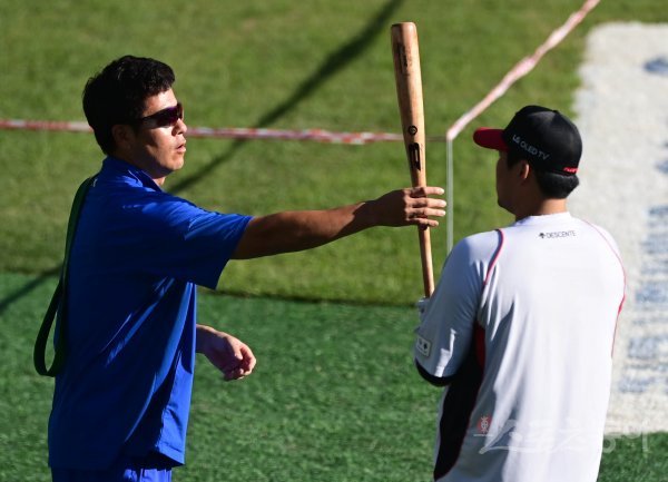 8일 서울 잠실야구장에서 ‘2020 신한은행 SOL KBO리그’ LG 트윈스와 삼성 라이온즈의 경기가 열린다. 경기 전 훈련에서 삼성 강민호가 LG 유강남의 배트를 잡고 있다.