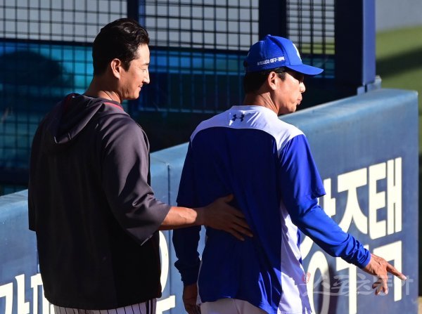 8일 서울 잠실야구장에서 ‘2020 신한은행 SOL KBO리그’ LG 트윈스와 삼성 라이온즈의 경기가 열린다. 경기 전 훈련에서 LG 박용택이 삼성 김용달 코치의 등을 만지고 있다.