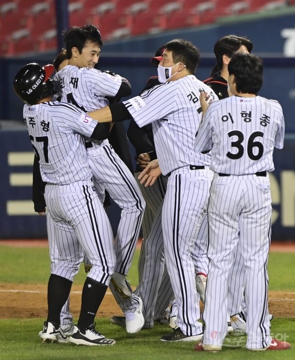 8일 서울 잠실야구장에서 ‘2020 신한은행 SOL KBO리그’ LG 트윈스와 삼성 라이온즈의 경기가 열렸다. 9회말 1사 만루 LG 신민재가 1타점 좌전 끝내기 안타를 쳐낸 뒤 동료들의 축하를 받고 있다.