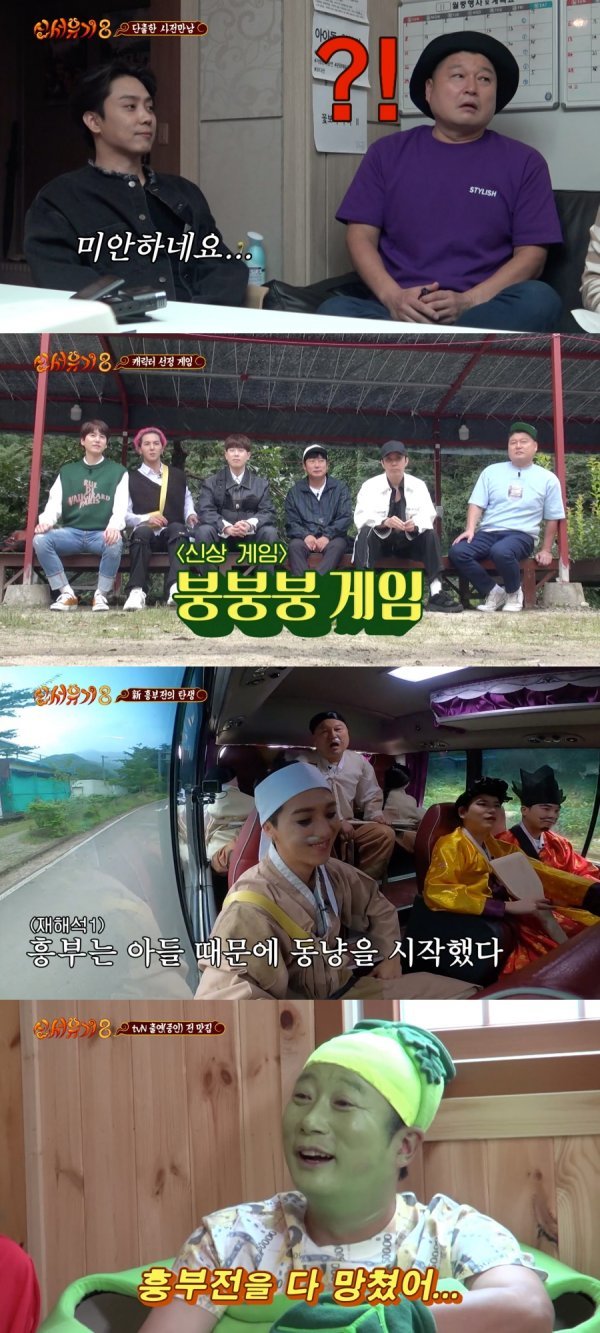 지리산 기슭에서 각각 ‘흥부전’ 캐릭터로 분한 이들은 역전된 관계성으로 또 한번 큰 웃음을 유발했다. 멤버들의 가차없는 몰아가기로 흥부 아들 분장을 하게 된 강호동은 적극적인 복수극에 나서 역대급 반전 캐릭터를 선보였다. 흥부 아들의 범접할 수 없는 기세에 흥부(송민호)와 놀부(피오)가 존댓말을 쓰는가 하면, 놀부 부인으로 분한 규현은 “흥부가 가난한 게 합의금 내주다 그런 것”이라고 말해 웃음을 불렀다. 박씨 의상을 버거워 하는 이수근과 왜인지 화나 있는 ‘은그리버드’ 제비 은지원도 웃음 포인트였다. 이들은 ‘흥부전’ 메인 캐릭터 흥부와 놀부를 압도하는 포스로 ‘新흥부전’을 완성하며 폭소를 자아냈다.