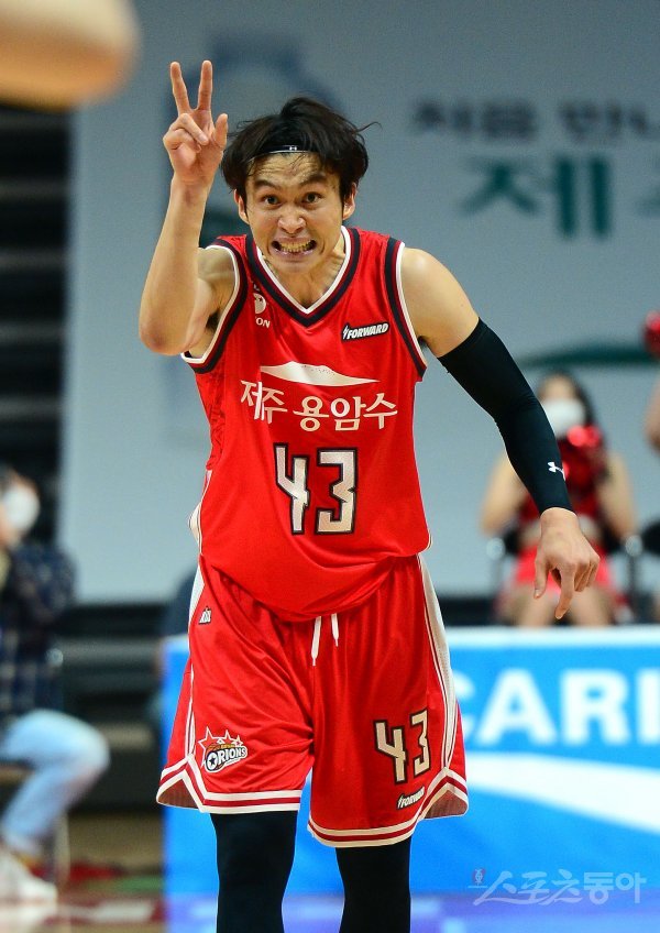 11일 경기도 고양체육관에서 열린 ‘2020-2021 현대모비스 프로농구’ 전주KCC와 고양오리온 경기에서 오리온 이대성이 3점슛을 성공시킨 후 기뻐하고 있다.