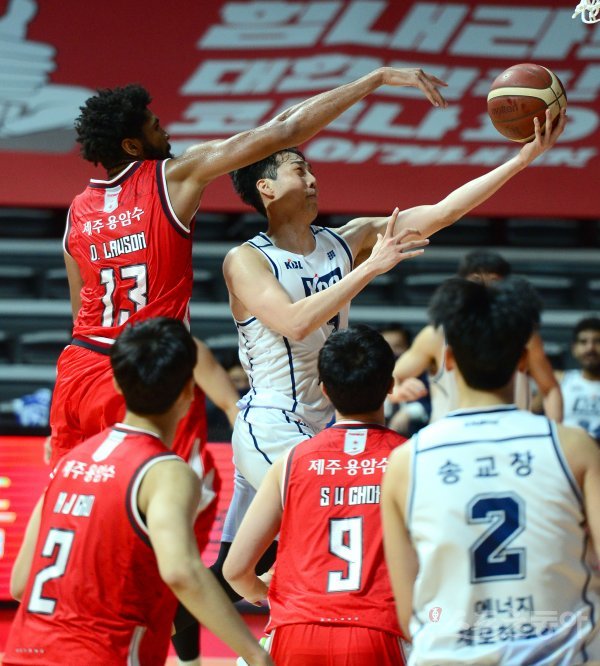 11일 경기도 고양체육관에서 열린 ‘2020-2021 현대모비스 프로농구’ 전주KCC와 고양오리온 경기에서 KCC 정창영이 오리온의 수비를 뚫고 골밑슛을 하고 있다.