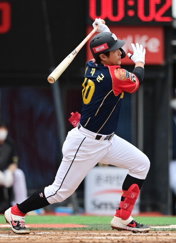 11일 경기도 수원 KT위즈파크에서 ‘2020 신한은행 SOL KBO리그’ KT 위즈와 두산 베어스의 경기가 열렸다. 1회말 1사 KT 황재균이 동점 좌월 솔로 홈런을 치고 있다.
