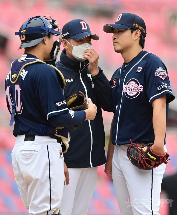 11일 경기도 수원 KT위즈파크에서 ‘2020 신한은행 SOL KBO리그’ KT 위즈와 두산 베어스의 경기가 열렸다. 3회말 1사 1루 상황에서 두산 최원형 코치가 마운드를 방문해 최원준과 이야기하고 있다.