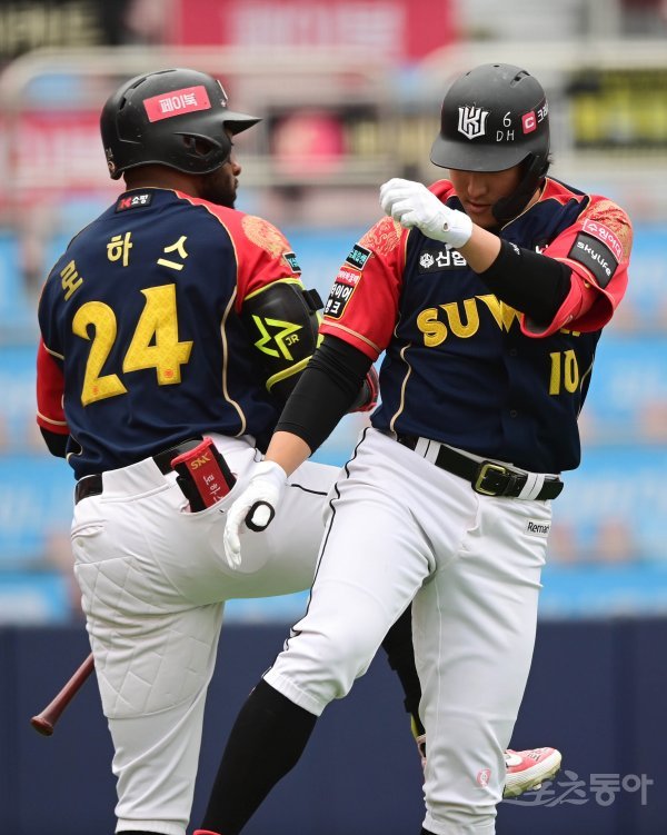 11일 경기도 수원 KT위즈파크에서 ‘2020 신한은행 SOL KBO리그’ KT 위즈와 두산 베어스의 경기가 열렸다. 1회말 1사 KT 황재균이 동점 좌월 솔로 홈런을 쳐낸 뒤 로하스와 세리머니를 하고 있다.