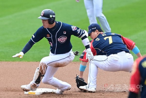 11일 경기도 수원 KT위즈파크에서 ‘2020 신한은행 SOL KBO리그’ KT 위즈와 두산 베어스의 경기가 열렸다. 1회초 무사 두산 허경민이 2루타를 쳐낸 뒤 2루에서 심판의 판정을 기다리고 있다.