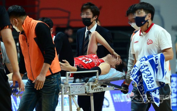 11일 경기도 고양체육관에서 열린 ‘2020-2021 현대모비스 프로농구’ 전주KCC와 고양오리온 경기에서 오리온 최진수가 부상으로 들것에 실려나가고 있다.